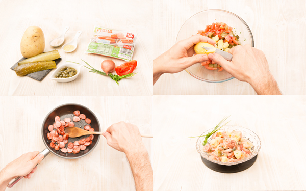 Pica la patata en dados no demasiado pequeños y mezcla todos los ingredientes en un bol: la cebolleta el cebollino, los pepinillo y los tomates picados, las salchichas y las alcaparras. Mezcla con mayonesa al gusto y sazona ligeramente.